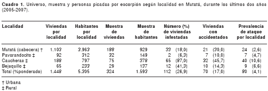 Materials and methods. The study was conducted in four localities of Mutatá and Urabá Counties in the province of Antioquia, Colombia. The sample consisted of 1,593 (929 urban, 664 rural) of the 5,305 exposed people, inhabitating 324 households (188 urban (58%); 136 rural (42%) of 1,448 houses total in the study area. An interview survey was performed in every selected family for a more realistic estimate of sting prevalence. Additionally, a prospective study was directed toward patients presenting scorpion stings at care at the local hospital over an 18-month period.