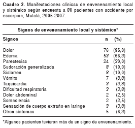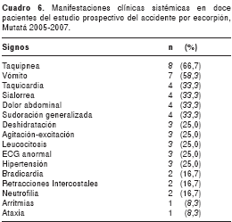 Doce pacientes consultaron al hospital de Mutatá durante un periodo de 18 meses (de septiembre de 2005 a febrero de 2007). Las edades oscilaron entre 1 y 59 años, los menores de 15 años fueron el grupo más numeroso, 8 pacientes (67,0%). La mayoría (8 personas) provenía de áreas rurales y el 67,0% eran hombres. El 92,0% de los accidentes fueron intradomiciliarios; los sitios anatómicos más frecuentes de contacto con los escorpiones, fueron las manos (42,0%) y los pies (42,0%). Todos los pacientes manifestaron no haber recibido primeros auxilios, pero tres de ellos (25,0%) admitieron algún tipo de medicina tradicional. El 100% de los pacientes fueron picados por T. asthenes. El tiempo mínimo trascurrido entre la picadura y la consulta hospitalaria fue de 15 minutos, el máximo de 135 minutos y la media de 55 minutos. Entre las manifestaciones clínicas locales, se presentó dolor en el 100,0% de los pacientes, edema en 17,0%, eritema en 8,3%, parestesias en 42% y sudoración local en 33%. Los signos sistémicos de toxicidad más frecuentes fueron la taquipnea (67%) y el vómito (58,0%) (cuadro 6).