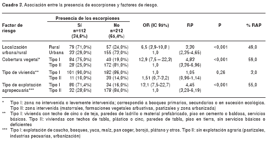 Se encontró asociación entre la variable uso del suelo y la presencia de escorpiones (OR=6,5; IC95% 3,3-10,8). La asociación muestra que los alacranes están apareciendo más fuertemente asociados con la zona rural; de igual manera, hay asociación con zonas boscosas bien conservadas (tipo I) (OR=12,9 IC95% 7,5-22,3) y con el tipo de explotación agraria alta (tipo I) (OR=13,1 IC95% 7,5-22,7) (cuadro 3).