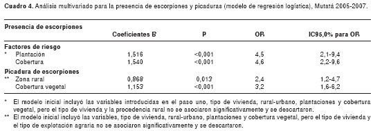 El análisis multivariado de regresión logística, efectuado para ajustar por los diferentes factores de confusión, indicó que las variables explicativas del modelo para la presencia de escorpiones, también fueron las plantaciones altas y las coberturas vegetales altas (cuadro 4).