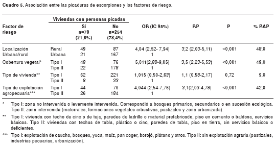 Cuando se estudian los factores de riesgo para la picadura por escorpiones, las mayores proporciones se explican, en casi la mitad de los casos, por su procedencia de la zona rural, por el tipo de cobertura vegetal y por su asociación con la explotación agropecuaria alta (cuadro 3). El porcentaje de riesgo atribuible de la población mostró que las picaduras por escorpiones, en toda la población de Mutatá, está ocurriendo, respectivamente, por el hecho de vivir cerca de coberturas vegetales tipo I y de explotaciones agrarias altas tipo I (cuadro 5).